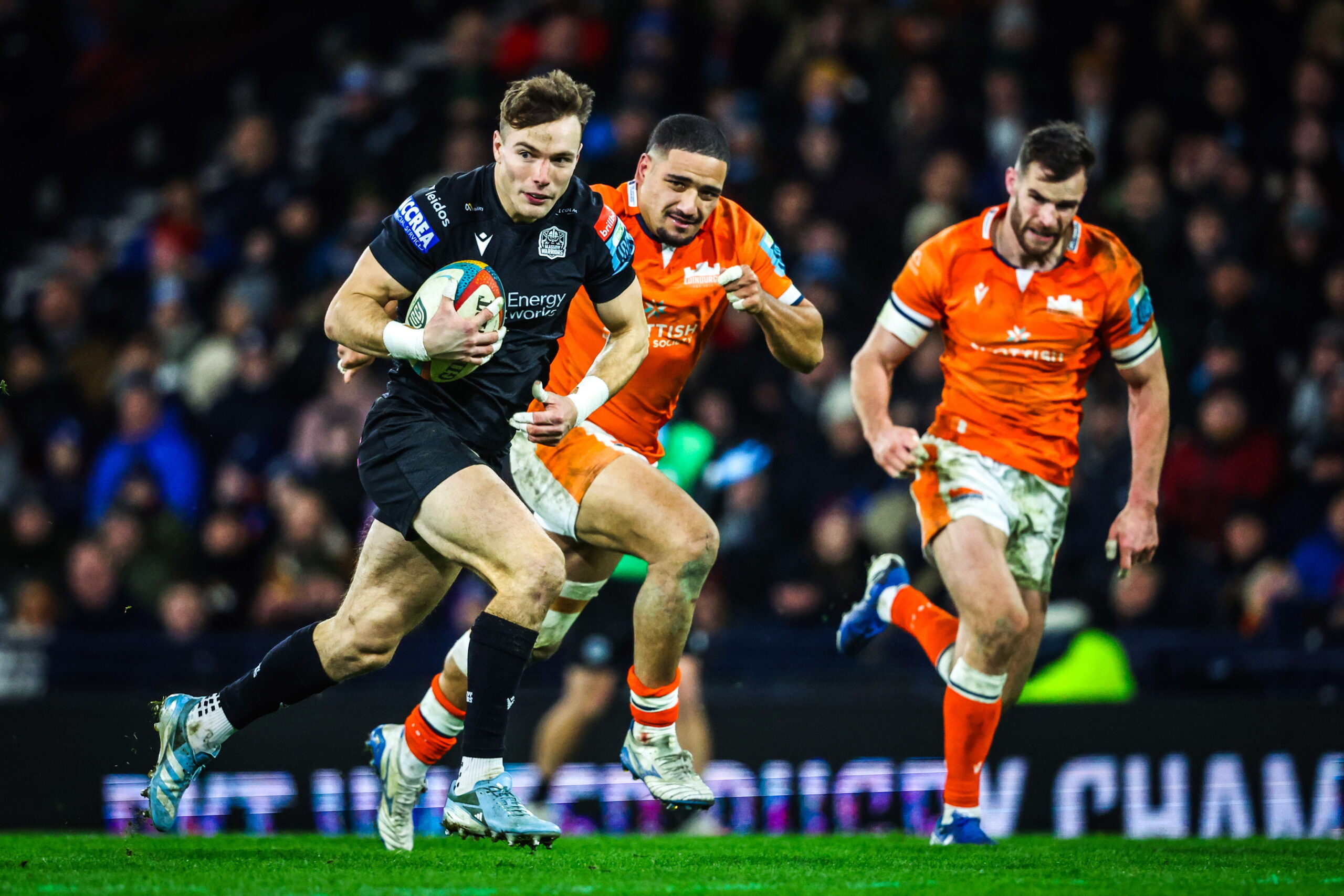 GLASGOW, SCOTLAND - DECEMBER 22: Glasgow's Jamie Dobie breaks clear before scoring a second half try during a United Rugby Championship match Glasgow Warriors and Edinburgh Rugby at Hampden Park, on December 22, 2024, in Glasgow, Scotland. (Photo by Ross MacDonald / SNS Group)