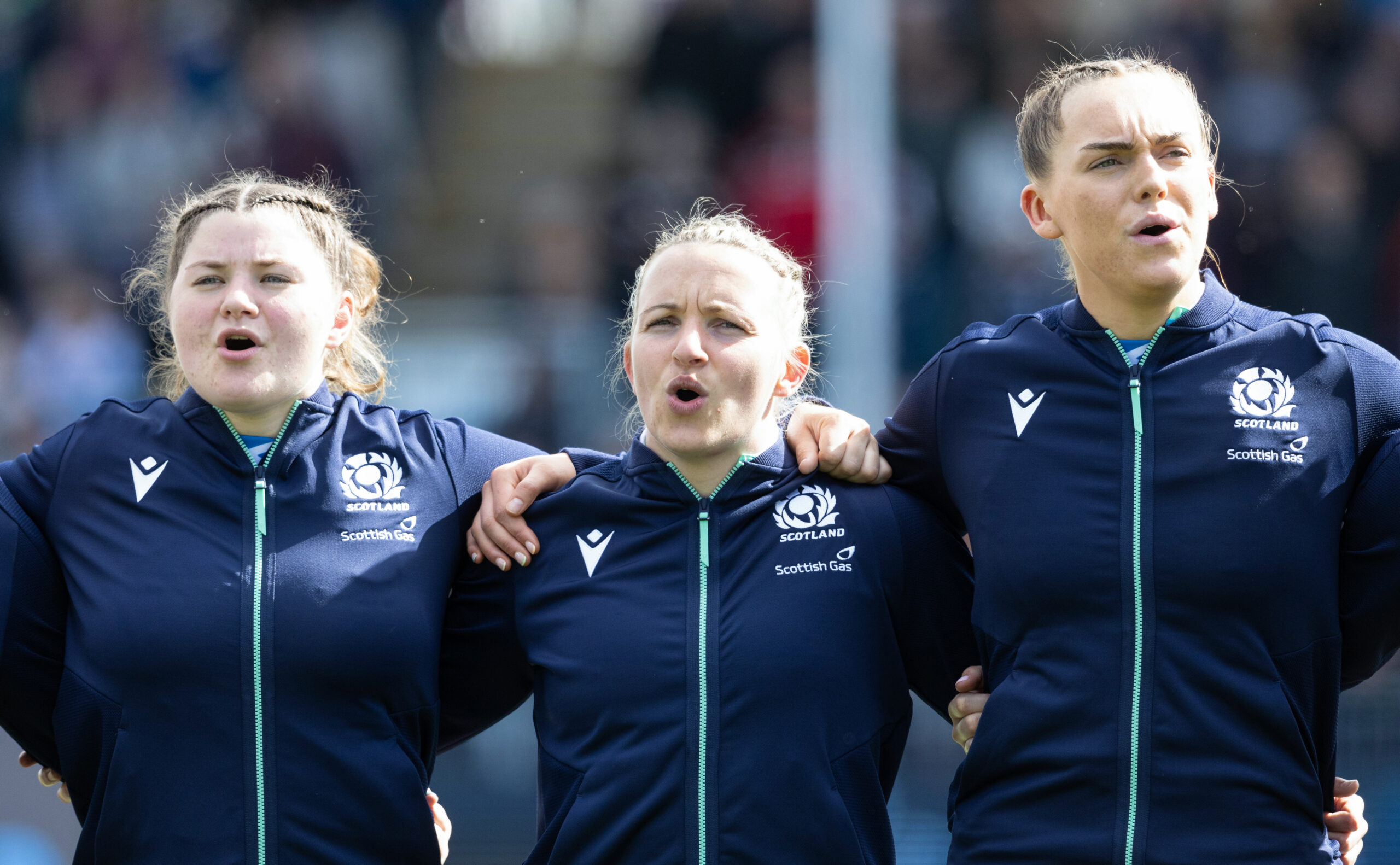 EDINBURGH, SCOTLAND - APRIL 13: Scotland's Elis Martin, Chloe Rollie and Emma Orr line up for the national anthem during a Guinness Women's Six Nations match between Scotland and Italy at The Hive Stadium, on April 13, 2025, in Edinburgh, Scotland. (Photo by Mark Scates / SNS Group)